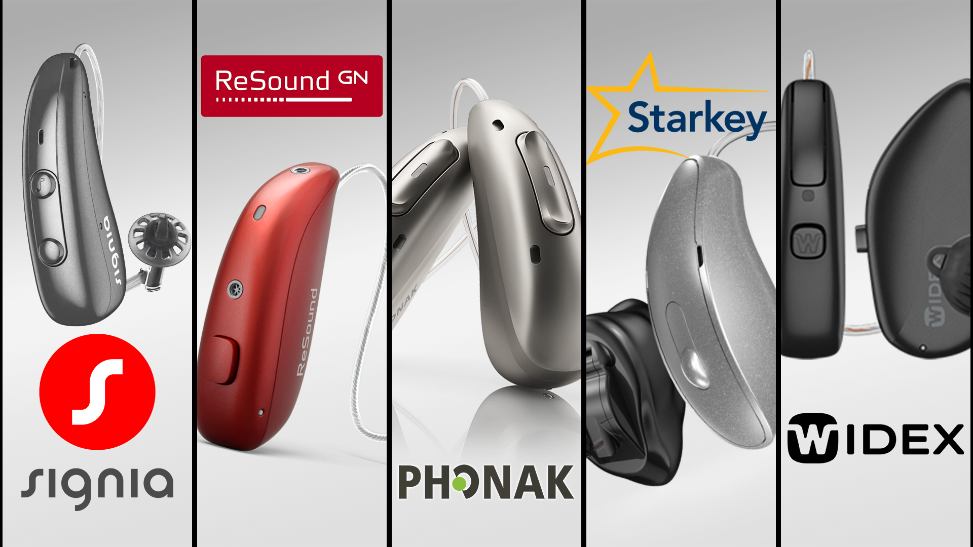 フォナック(Phonak)、オーティコン(Oticon)、シグニア(Signia)、リサウンド(GN Resound)、スターキー(Starkey)、ワイデックス(Widex)です。