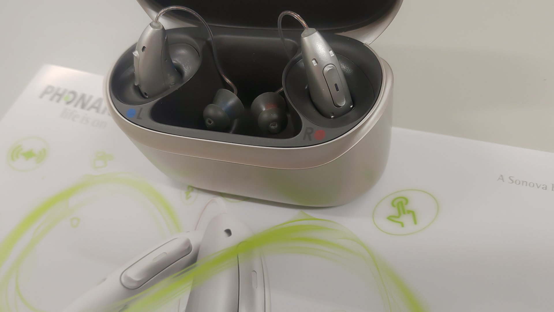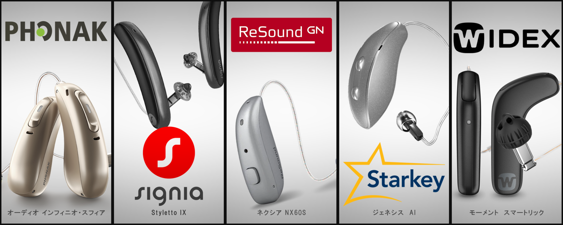 補聴器メーカーは世界に多数ありますが、世界6大メーカーと呼ばれている「Phonak」、「Oticon」、「Signia」、「GN Resound」、「Starkey」、「WIDEX」が約9割を占めていると言われています。世界的にシェアNo.1と言われているPhonakを始め、各メーカーの取り扱いを揃えております。